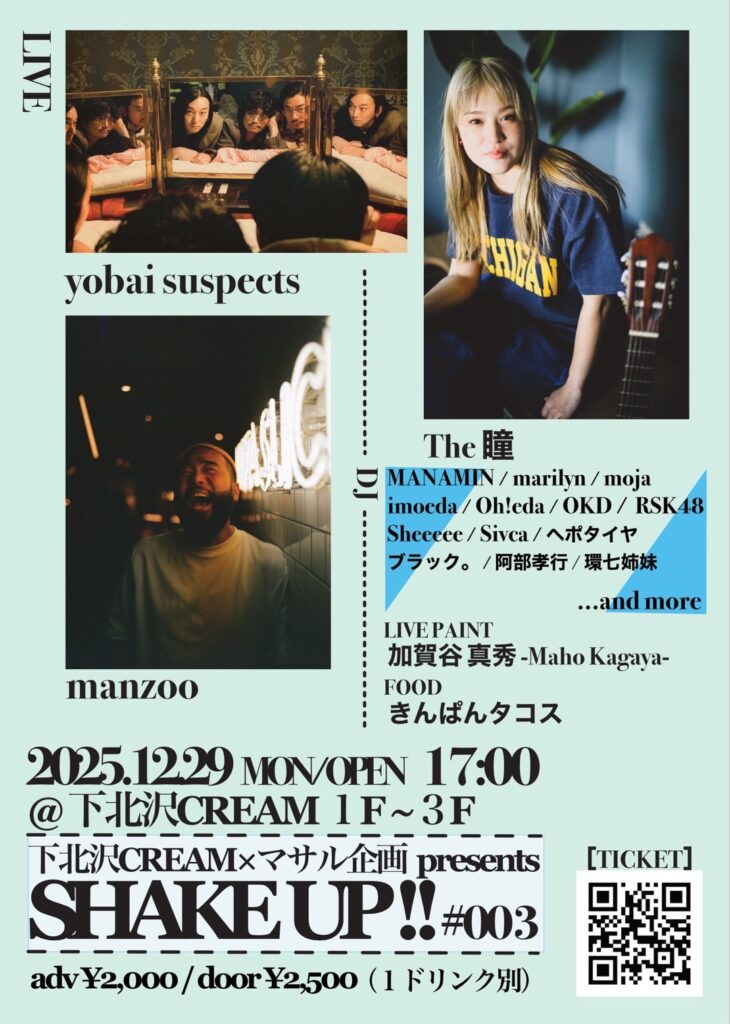 LIVE【yobai suspects / manzoo 】DJ【MANAMIN / marilyn / moja / imoeda / Oh!eda / OKD / RSK48 / ブラック。/ 阿部孝行 / 環七姉妹 ...and more】LIVE PAINT 【加賀谷 真秀-Maho Kagaya-】FOOD【きんぱんタコス】